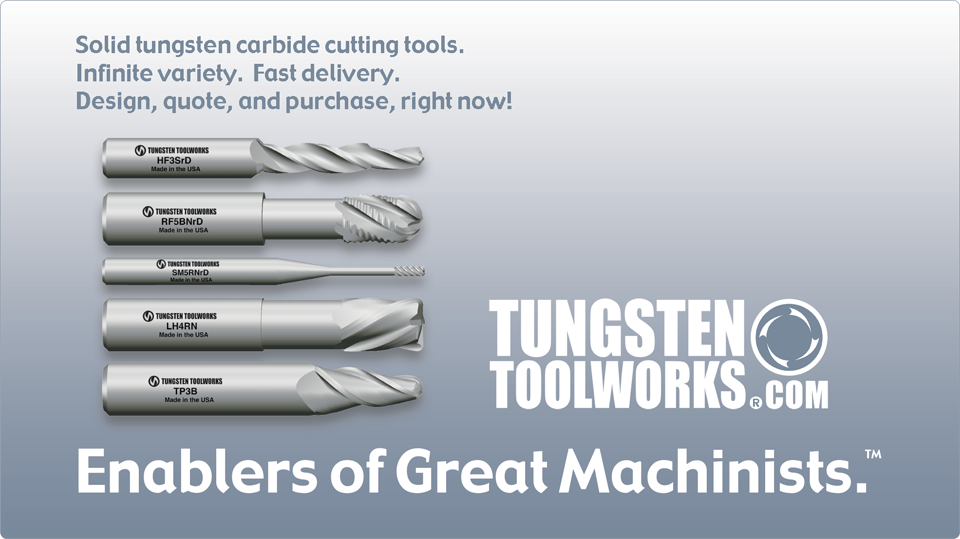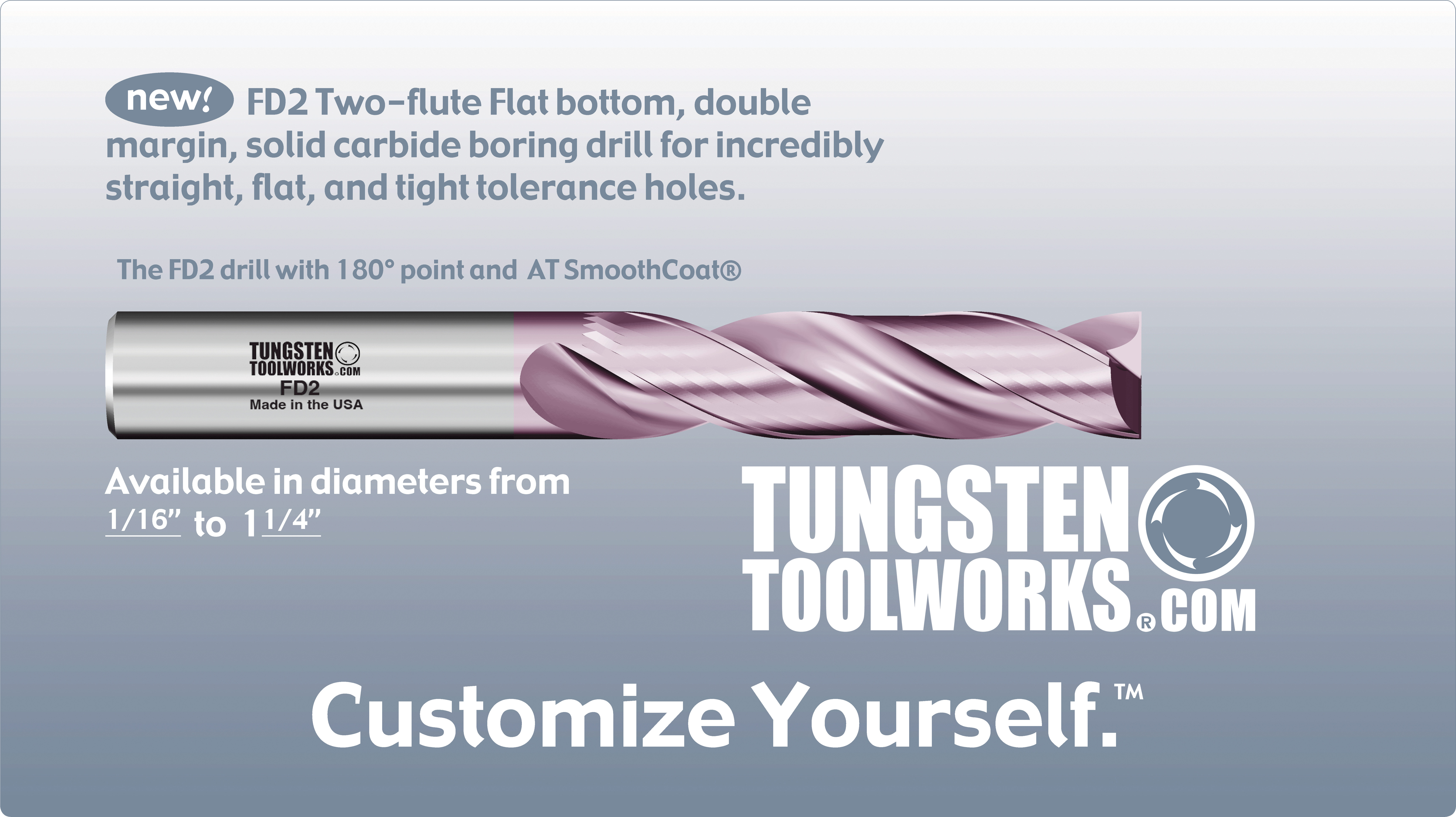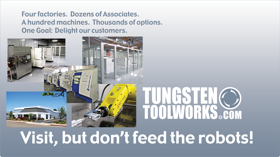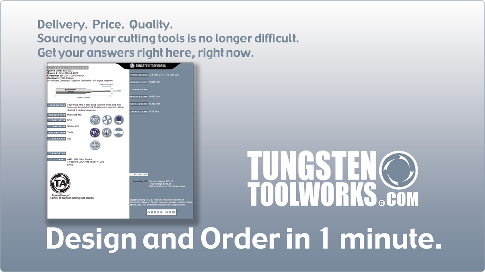 Tungsten ToolWorks is a manufacturer of customized (special) solid carbide cutting tools, sold worldwide under the Tungsten ToolWorks brand name. Products include solid carbide end mills, drills, reamers, burrs, micro tools, sub-miniature tools, micro tools, engraving tools, boring tools, keyseat cutters, burrs, slitting saws, carbide cylinders, countersinks, routers, radius mills, CBN tools, compression tools, and more. Technologies include SmoothCoat PVD hard coatings, SmoothGrind polished cutting edges, SmoothEdge prep and hone, and SmoothContricity shrink fit ready shanks. Coatings include D2 CVD diamond, D1 PVD amorphous diamond, TA TiAlN, AT AlTiN, TN TiN, TC TiCN, and A1 TiB2. Industries using our products include aerospace, semiconductor, die & mold, micro (nano) machining, woodworking, medical, consumer electronics, automotive and more. Workpiece materials to be drilled, milled, reamed, routed, engraved and more include titanium (6Al-4V, 5553), stainless (303, 304, 316, 410, 420, 440C, 15-5, 17-4, 13-8, 316L), tool steels (A2, D2, H13), general steels (1018, 1020, 4140, 4340, P20), Inconel (625, 718), cast iron, non-ferrous materials including aluminum, copper, brass, bronze, wood & plastics, CFRP (carbon fiber reinforced plastic), graphite, composites, fiberglass, and more. Tungsten ToolWorks is a Tool Alliance company.